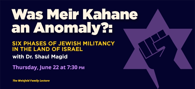 There are usually one of two explanations proffered to understand Meir Kahane, the militant American rabbi who founded the Jewish Defense League in America in 1968 and the KACH party in Israel in 1971. The first is that he was an anomaly, a product of the American race and culture wars of the 1960s that he tried to translate for an Israeli audience. The second is that his militarism was the product of a dangerous amalgam of religion and politics. In this presentation, Dr. Magid will argue neither is true. Rather, he claims Kahane is a particular instantiation of a history of Jewish militancy in Mandate Palestine and then Israel.
