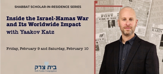 You’ve seen him in the news and on TV as an expert commentator on the war in Israel. Now, Yaakov Katz will visit Beth Tzedec as our scholar-in-residence to share his firsthand knowledge from the Israel/Gaza war. What good news is there to share from the current IDF campaign, and what challenges lay ahead? What will be the impact of the recent Supreme Court rulings, and what will happen to the Israeli government? What about the day after the war?