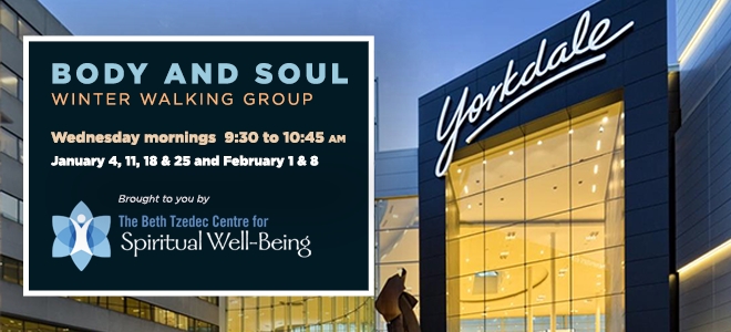 Wednesday mornings in January and February, exercise your body and soul with Rabbi Robyn Fryer Bodzin for a bit of Torah and some indoor walking at Yorkdale Mall. We will meet in front of Roots and learn a bit of Torah together before we walk.